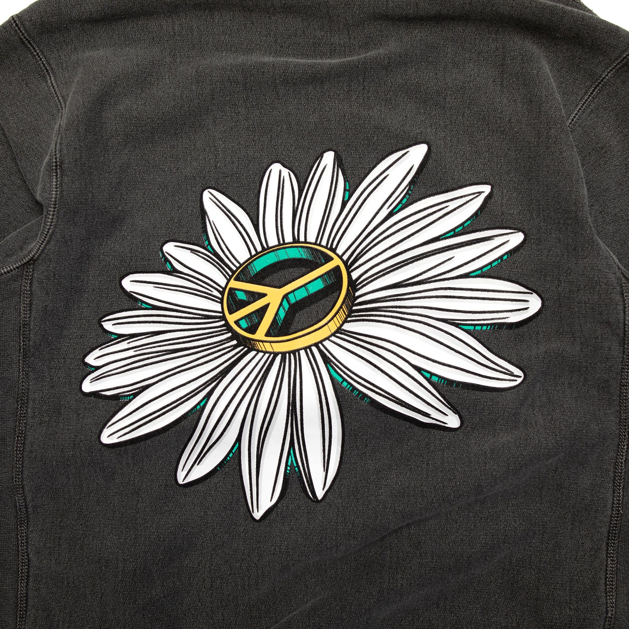 The Daisy Hoodie from Raised by Wolves is a hooded sweatshirt made for a regular fit. 3D screen printed artwork by visual artist Mort. Three-piece lined hood for durability and protection. Ribbing details at hood, cuffs, side panels and bottom hem on 360 gsm crossgrain carded cotton fleece. Made in Canada.