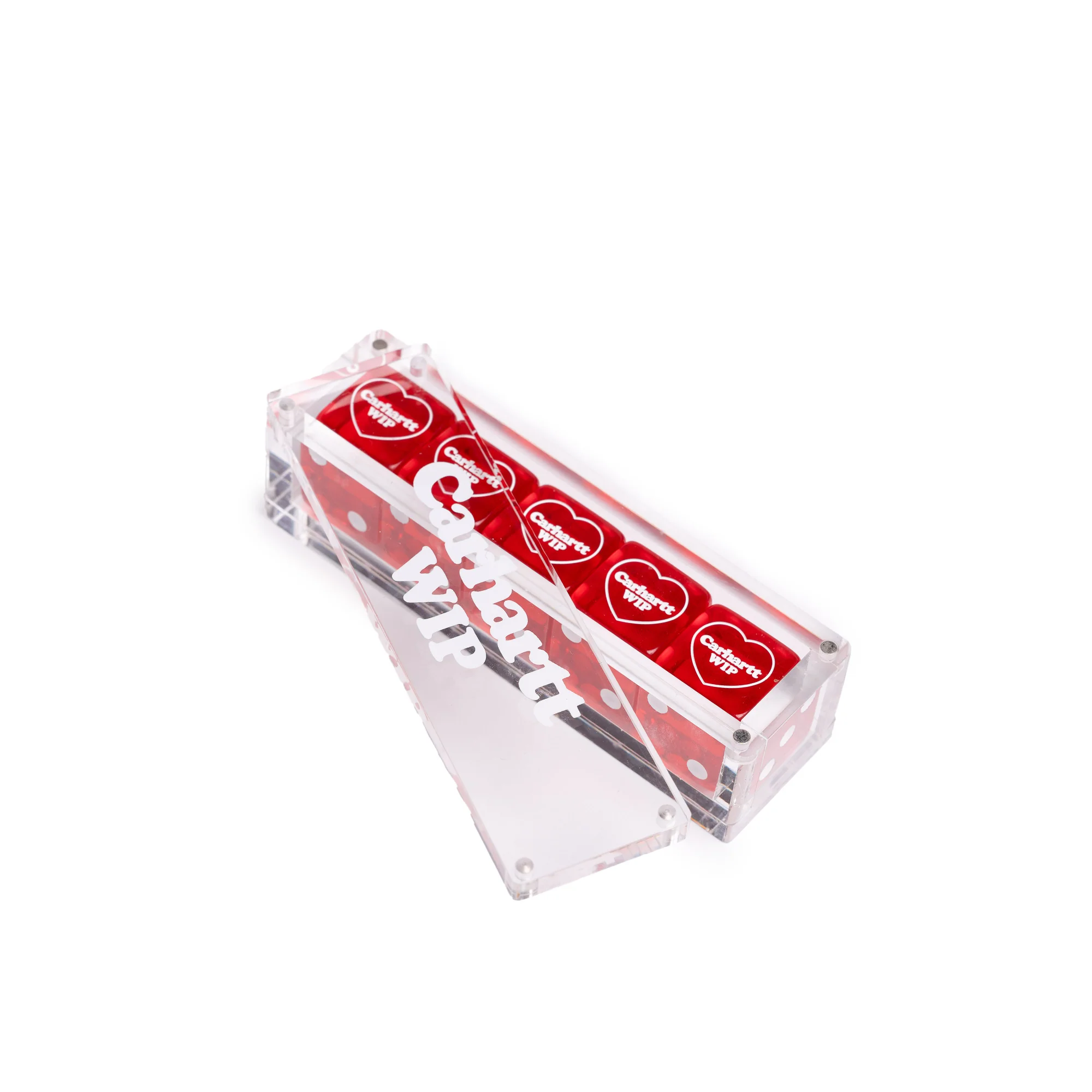 The Heart Dice Set comprises a set of five dice in a clear case, detailed with graphic lettering. Each die features an embossed graphic.
