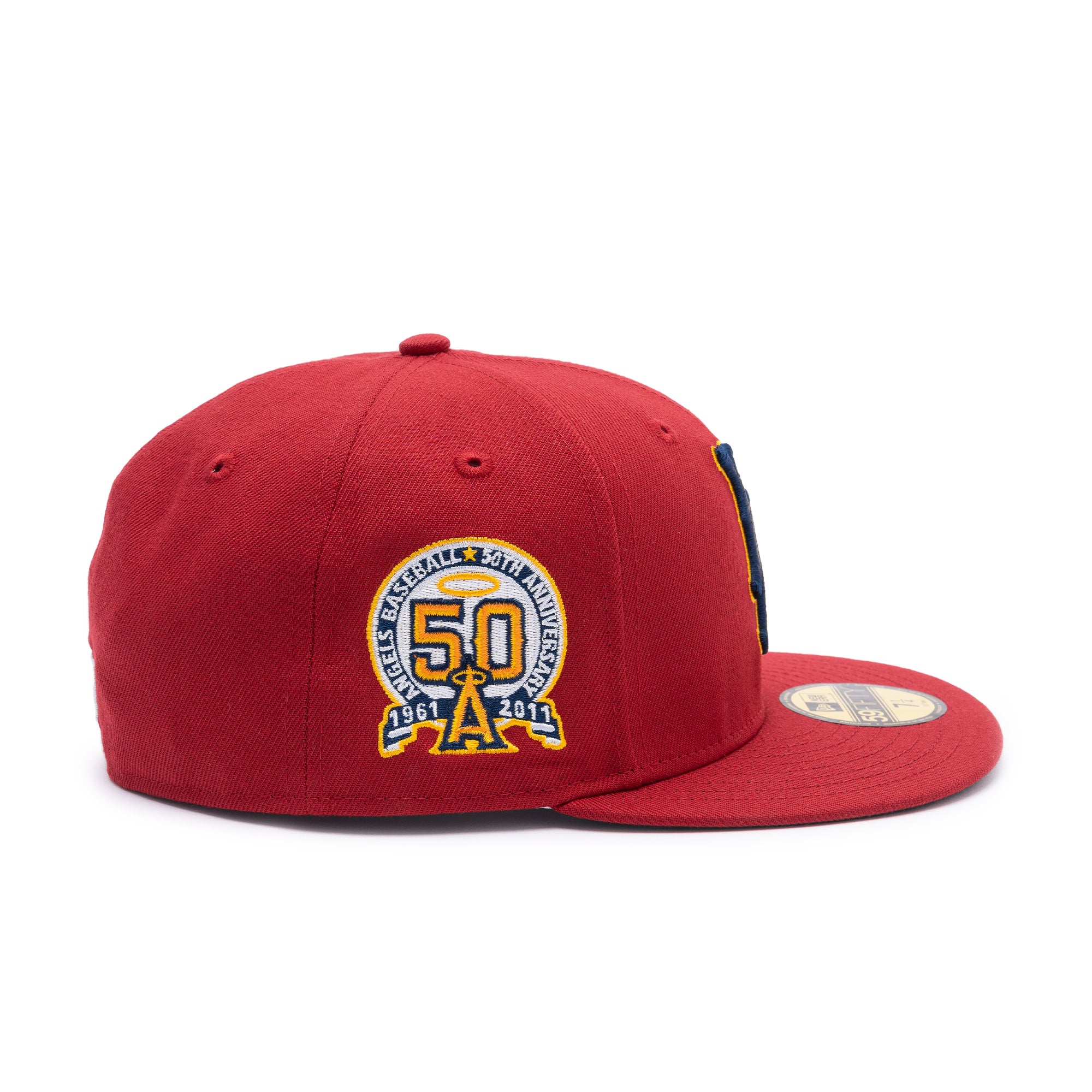 BEL-AIR SERIES: The Los Angeles Angels 50th Ann. 59FIFTY Cap in Pinot Red takes inspiration from the reversed academy jacket worn by the one and only Fresh Prince - featuring an embroidered Angels logo at the front panel with a 50th Ann. patch at the right-wear side. MLB Batterman logo at the rear. Additional details include a Navy undervisor. Embroidered eyelets for ventilation.