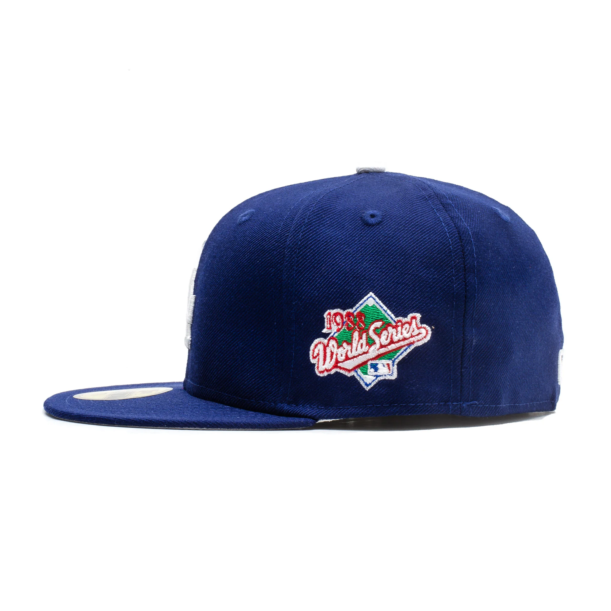 The Los Angeles Dodgers 1998 World Series Patch 59FIFTY Fitted Cap features an embroidered Dodgers logo at the front panel with the 1998 World Series patch at the left-wear side and an MLB Batterman logo at the rear. Additional details include a grey undervisor. Embroidered eyelets for ventilation.