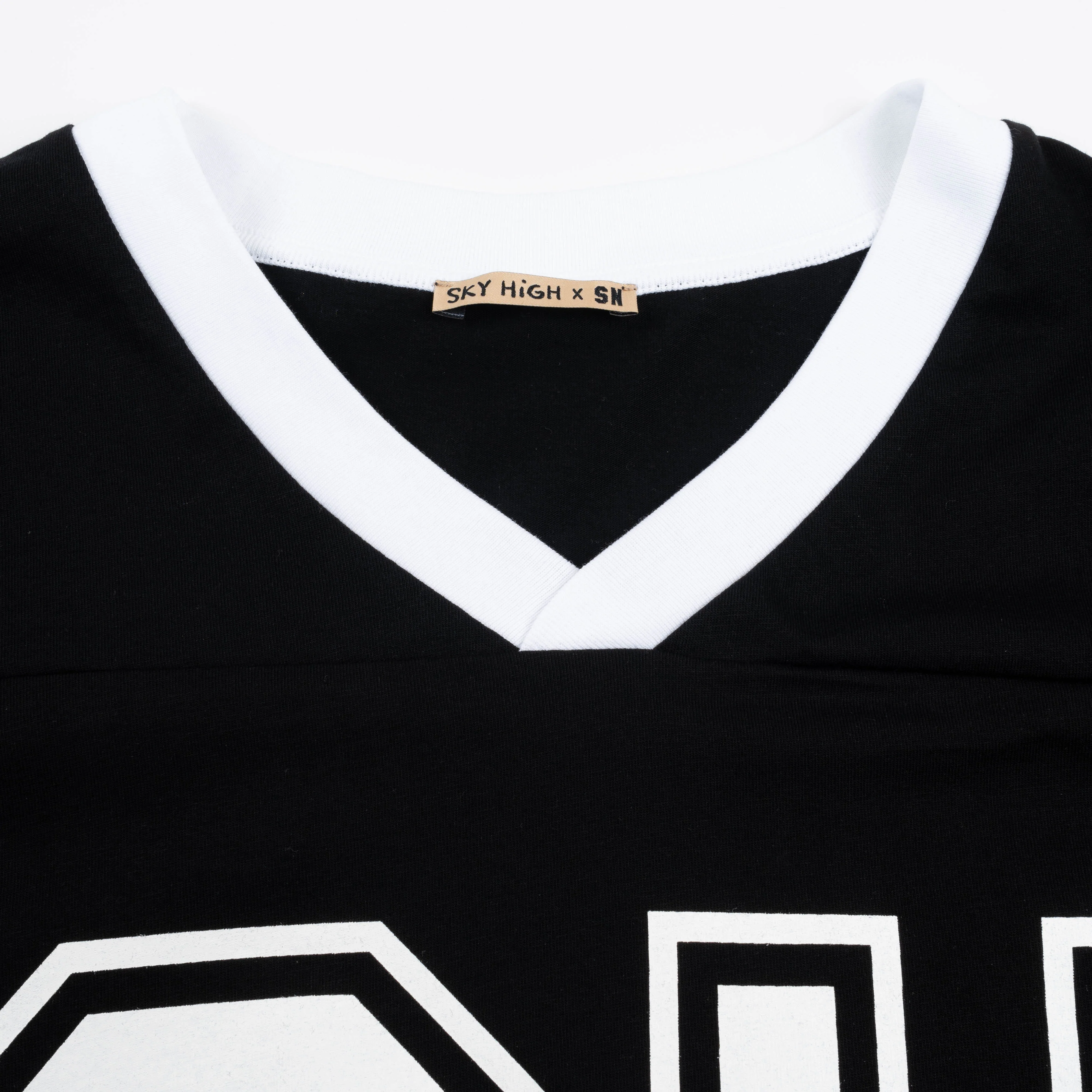 In collaboration with Samira Nasr, Editor in Chief of Harperās Bazaar U.S, we have created a capsule collection that is inspired by the idea of her go-to basics and her day-to-day life. The sports shirt is oversized and features a V-neck and elongated short sleeves. Jersey like block stripes adorn the sleeves. The shirt is completed with an 04 on the front and back and SKY HIGH on the top back.